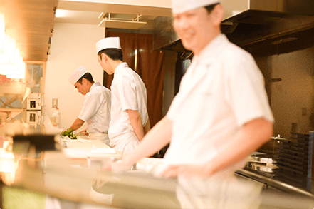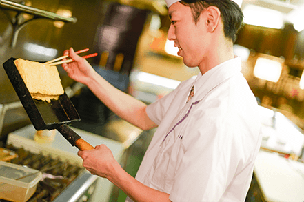 出し巻きの調理、魚の下処理、一品料理の仕込みなど。ひとつひとつの作業を素早く丁寧に。スピードと美しさを意識しながら、板前たちは日々腕を磨いています。