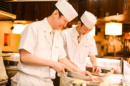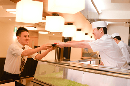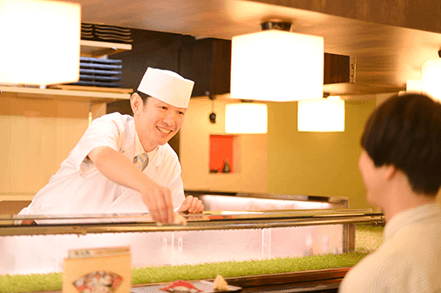 すしざんまいの板前は、握りや調理の腕だけでなく、会話でもお客様をもてなします。『明るく・楽しく・元気よく』を常に意識し、カウンターに立ちます。